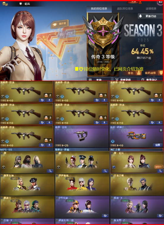 英雄级道具数量:77 王者级道具数:4 枪王排位等级:传奇 账号类型:生化号 到时不下线:1 分销起租时长:2 段位积分:3246 排位赛:允许 VIP等级:VIP6