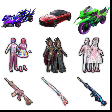bgt1★198套装176枪皮★21粉套6载具1僚机★平底锅特效★阿斯顿马丁★兰博★鬼马风驰摩托★暗夜玫瑰特效大炮...