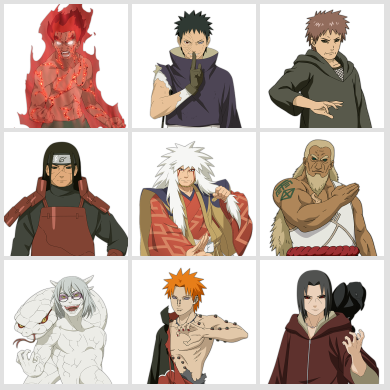 九喇嘛水门、暴怒第六尾、自来也(传说三忍)、漂泊带土、百战鼬、秽土鼬、天道超、须佐止水等
