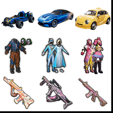红装木乃伊️雪国幻梦️怪诞乔克️赤蝎幽灵️都市猎人️金鞋️巡查衣️萌神柯基️夏日倾情️12吧特效枪️6个载具