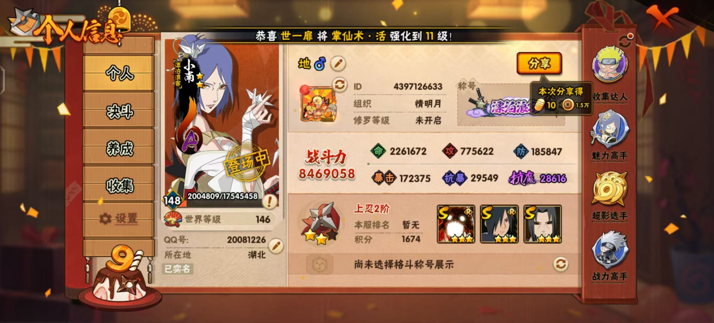 适配系统:安卓 账号类型(腾讯):QQ 战力值:846W A忍者数量:41 S级忍者数:15
