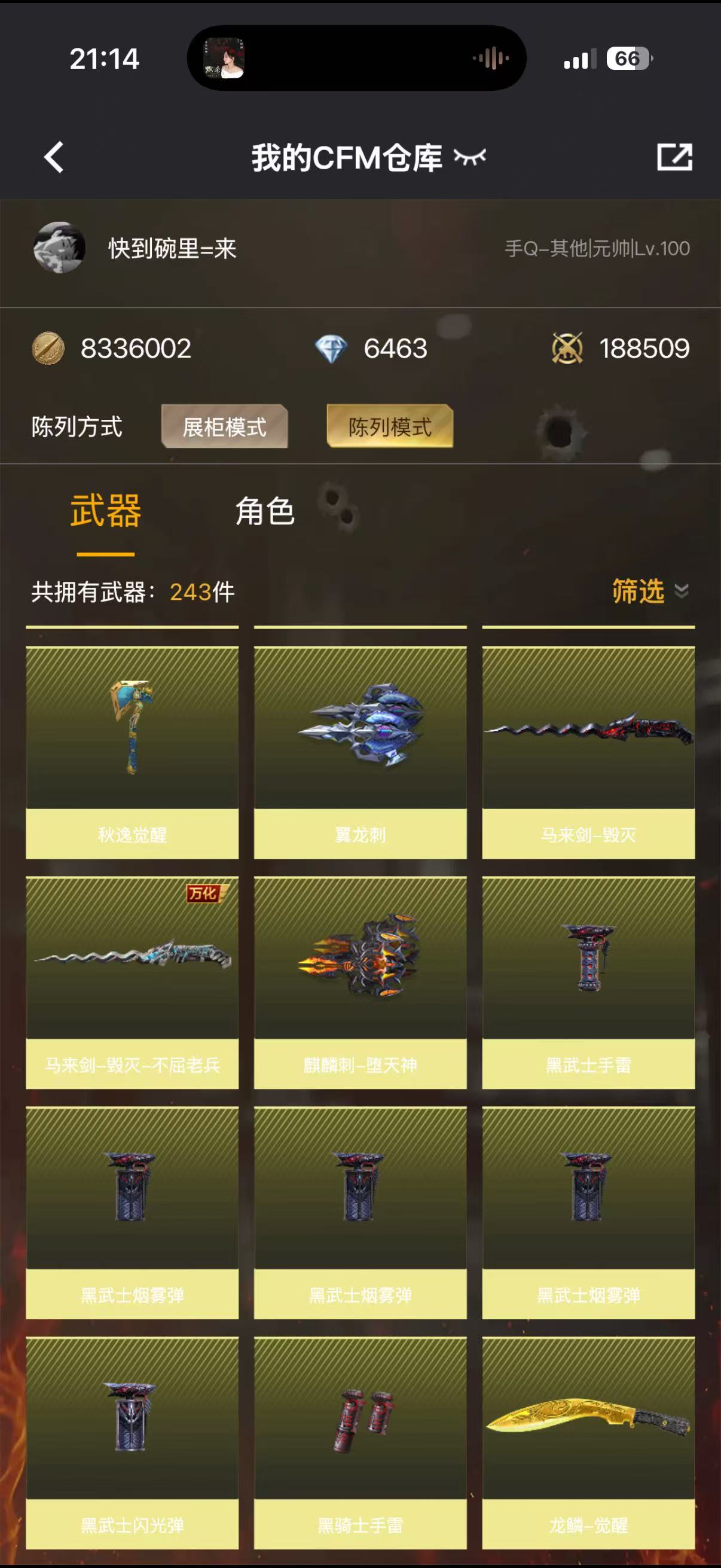 英雄武器数:120 王者武器数:5 段位:枪王 VIP等级:V7 角色数量:12 分销起租时长:2 适配系统:安卓 账号类型(腾讯):QQ