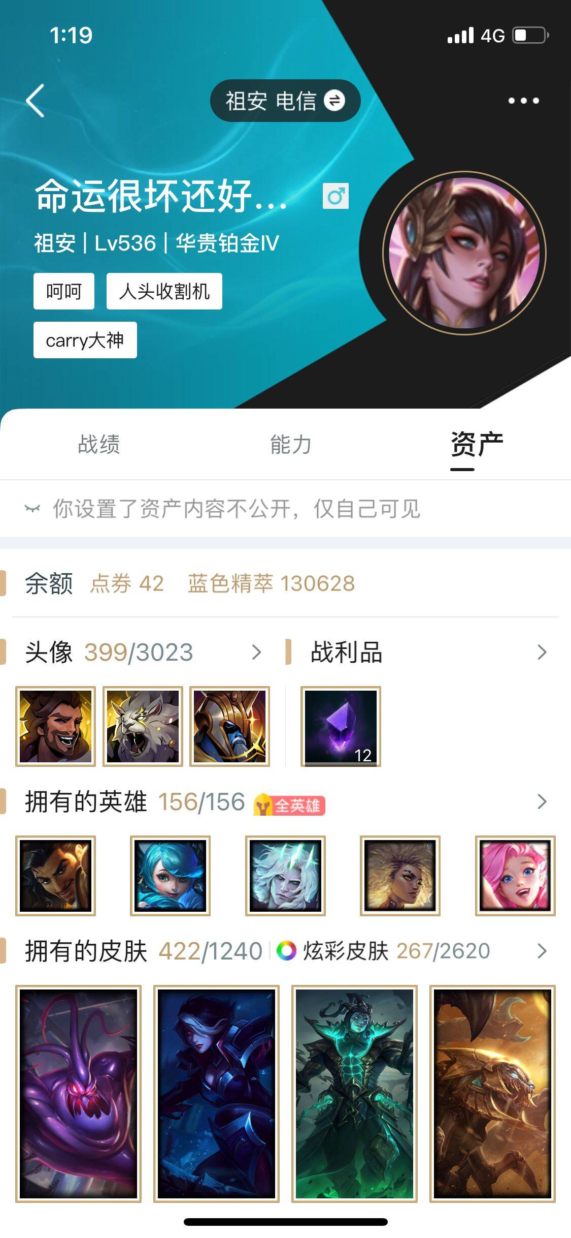 角色等级:550 角色名:野猪佩奇 排位赛:允许 单双排段位:华贵铂金II 灵活组排段位:- 英雄数量:172 皮肤数量:180 双人作战段位:无段位 分销起租时长:1