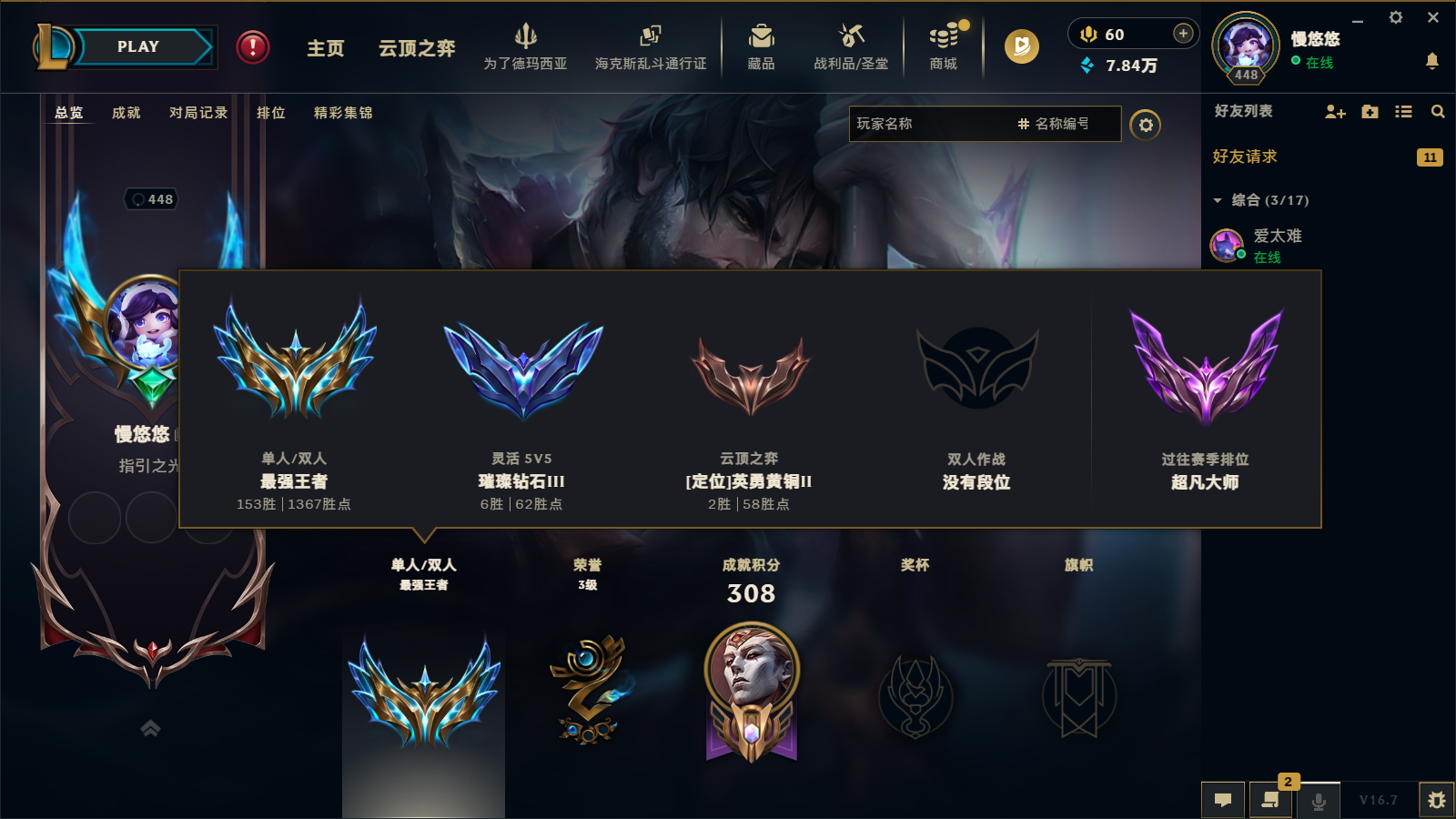 艾欧尼亚单双排*强王者边框回城装逼带妹号
