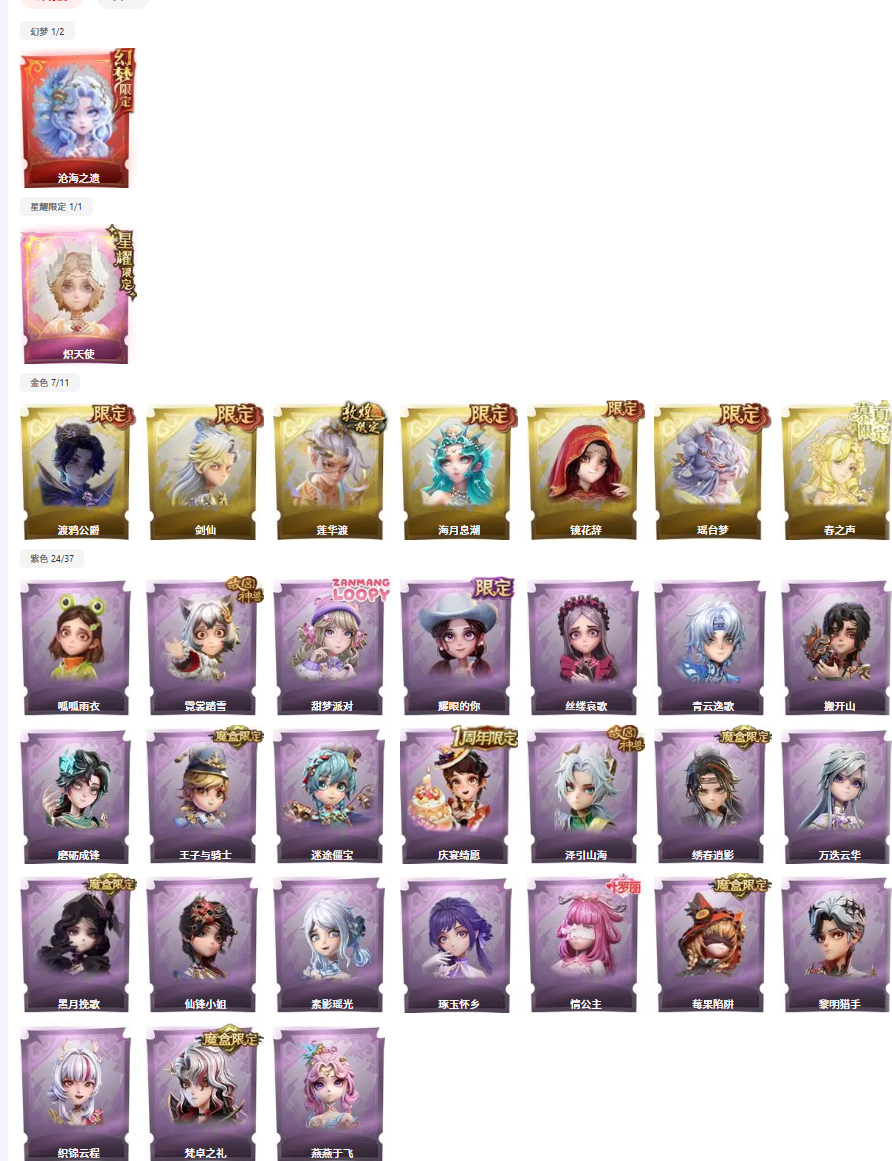 金色皮肤:7 紫色皮肤:24 是否有兔宝:否 道具皮肤:99