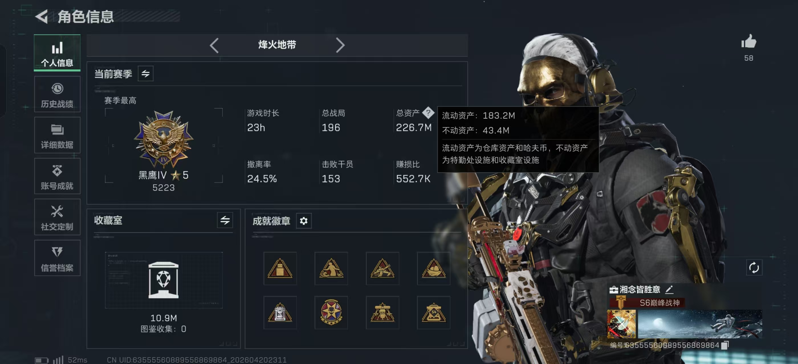 哈夫币比例:10 烽火地带等级:60 全面战场段位:列兵 负重等级:6级 典藏皮肤数:13 哈夫币:142643503 载具皮肤数:27 AWM红弹数量:99 角色名:湘念皆胜意 六套装备数量:19 烽火地带段位:黑鹰 干员数:12 体力等级:满级 普通皮肤数:290
